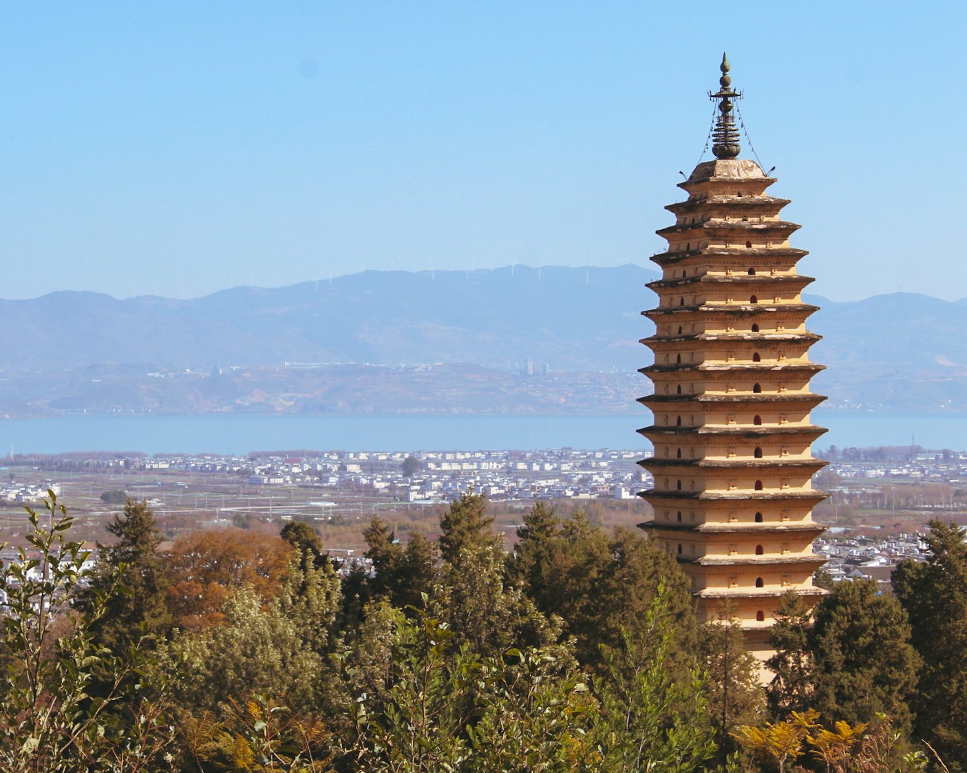 Looking out from my seat 500m up Cangshan mountain I had a fantastic view of Erhai lake: the source of the Mekong river. I could also see the famous ancient three pagodas – which I had visited the previous day – and the ancient walled city of Dali where I was staying in a hostel.