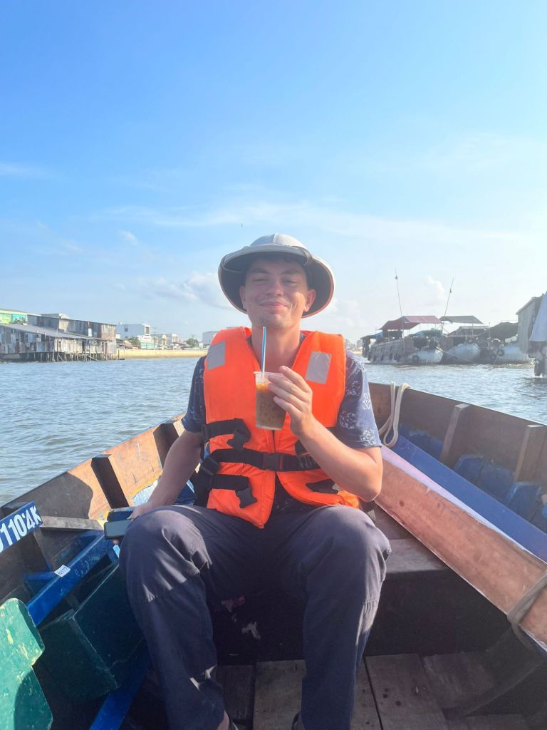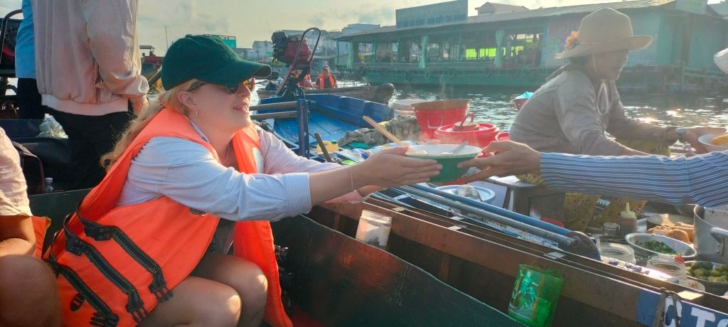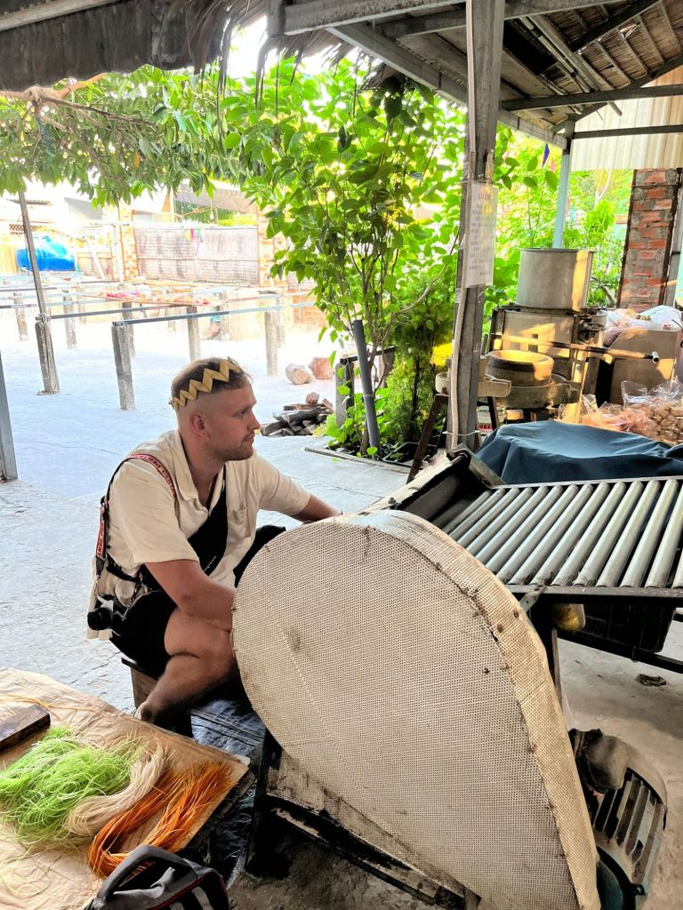 Day two dawned with a boat pick-up straight from our doorstep, navigating the labyrinth of canals that crisscross the Mekong Delta like a watery highway network (apparently work on the network started nearly 2000 years ago!). First stop was a noodle factory, where we rolled up our sleeves to craft some colourful noodles. Then, onto the famous floating market. The floating market is a bustling hub of commerce, where boats of all shapes and sizes gather from all over the region to sell wholesale produce. Some enterprising locals were selling piping hot noodles and coffee to fuel the hungry market-goers. It would have been rude to not try it!