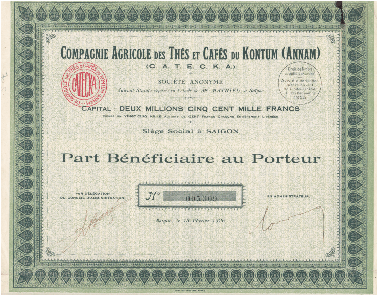 Amidst this backdrop, the most renowned tea plantation of the era emerged: CATECKA (Compagnie Agricole des Thés et Cafés du Kontum Annam) situated near Bàu Cạn and established in the same pivotal year of 1925. Thanks to the Gia Lai Museum for some wonderful resources (1, 2, 3) so I didn’t have to dredge through too much French for my research.