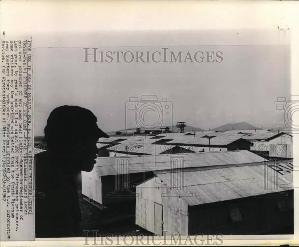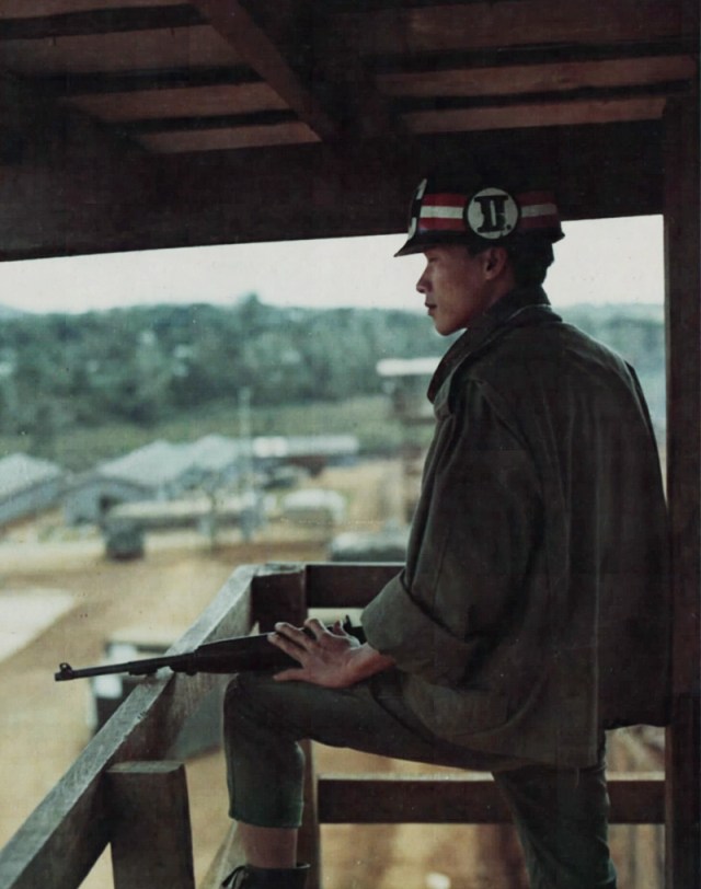 source: fold3.com – Nov 14, 1968. A Quan Canh (ARVN Military Police) stands guard in a guard tower at the POW camp.