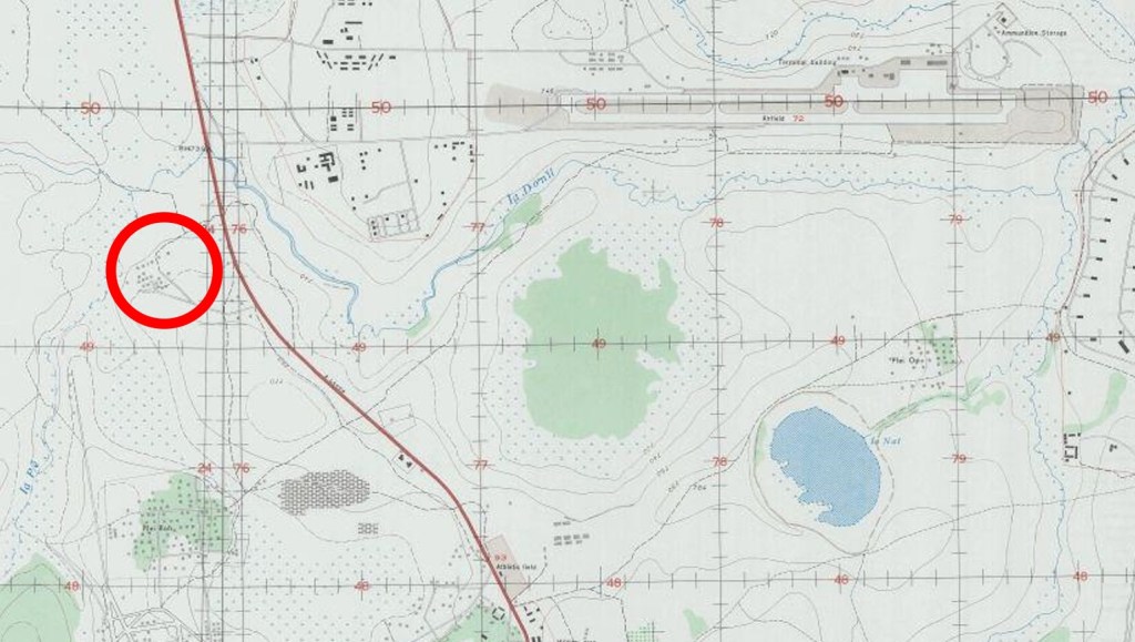My educated guess of where the POW camp was. The red road is the modern Phạm Văn Đồng street, Pleiku Airbase (now the airport) can be seen at the top right and Plei Roh can be seen at the bottom left. From the Pleiku city map Series L909 .
