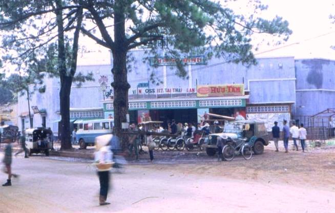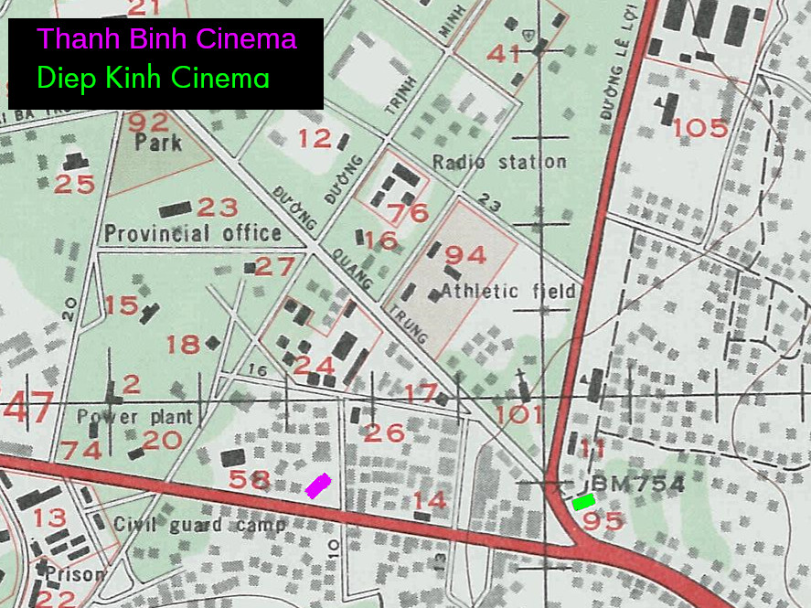 Some digging revealed that Pleiku did indeed have cinemas, even before 1975. And not just one, but at least two large theaters: Diep Kinh, Thanh Binh. They were on Hoang Dieu, the main road now called Hung Vuong, less than 300 meters apart. These theaters even had mezzanine seating, classy! (source)