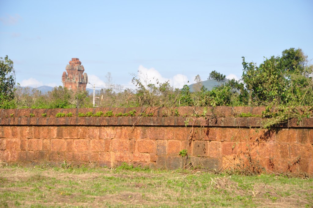 I parked the moped and slipped in through a small open gate beside the main entrance. Inside, I found myself alone in a two-hectare grassy field, hemmed in by a wall of large orange stone slabs. A flagpole stood proud in the centre, flanked by a few pagoda-esque structures. It is the sort of place where you might want to stretch out on the grass under a tree with a flask of iced tea and a bánh mì and listen to the birds singing. So that’s exactly what I did (I’d had the foresight to buy a bánh mì Vietnamese sandwich on the road). Off to the east, perched on a low hill outside the tourist zone, I could see a Cham tower watching quietly over the empty field.