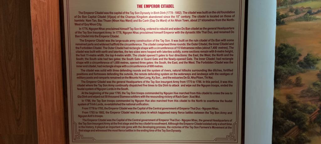 He chose the site of Chà Bàn for his center which then became known as Hoàng Đế Citadel. The interim time was a period of the area being opened up for Vietnamese people to move from the north and settle (source). There are records that prior, the Nguyễn clan had a fortification just 1km north of Chà Bàn’s outer wall, but when Nguyễn Nhạc defeated these forces he chose to relocate to the heard of the old Cham citadel. At the Quang Trung Museum, a mural shows an artist’s impression of the citadel during Tây Sơn rule.