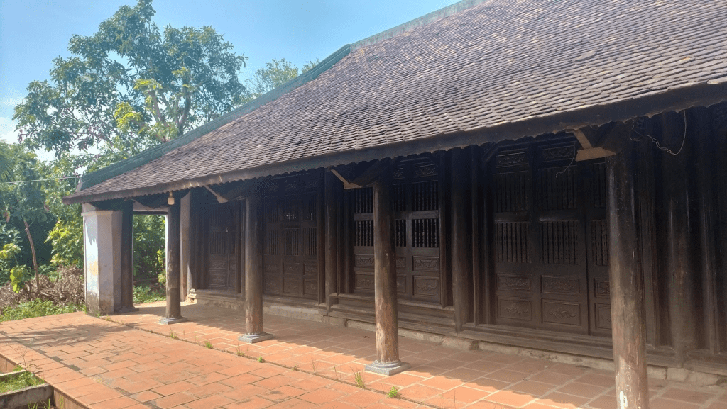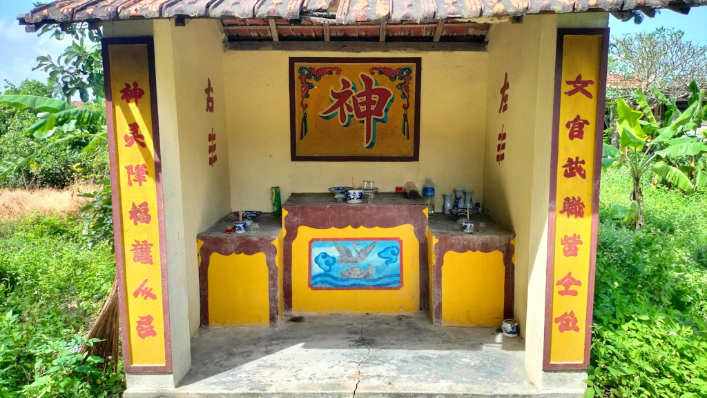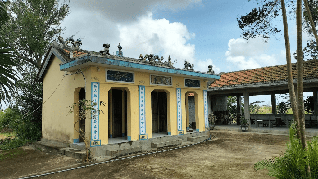 Đình Phú Sen had no pin on Google Maps, no photographs, no digital footprint. Armed only with a photo from the museum and the name of the commune, I rode into the village and stopped at a small bakery, buying a few cakes as an excuse to ask for directions. I followed the guidance slowly, scanning for anything that looked older than its surroundings.