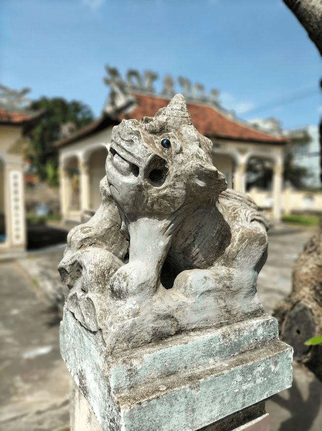I nearly passed it. What caught my eye first was a family gathering under a gazebo. Behind it, half-hidden among trees, stood a low, weathered structure. Outside, a group of children of mixed ages were loitering. “We’re a lion dance troupe!” they told me and eagerly showed me their drums and cymbals. When I asked whether this was Đình Phú Sen, holding up the museum photo, they erupted with excitement and told me it was.
