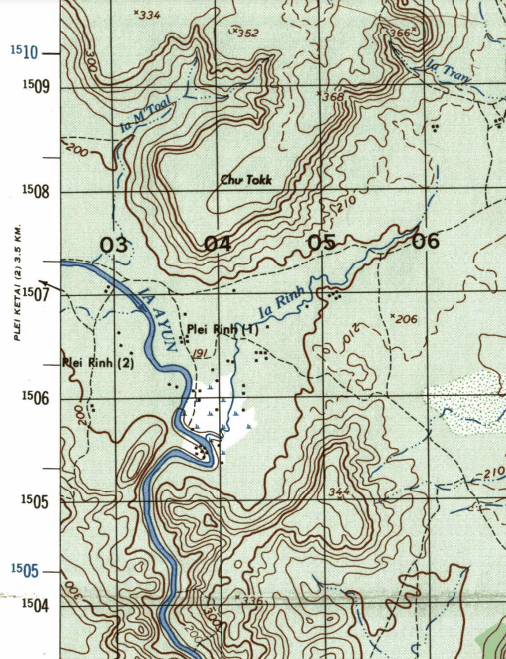 The Ayun Valley is a striking contrast to the otherwise flat terrain of the Pleiku Plateau. From the ground, the plateau appears unbroken until the valley suddenly reveals itself—a vast, hidden expanse carved into the land. I was unaware of its existence during my first years in Pleiku until studying detailed 1:50,000 maps revealed the contours of this dramatic feature. Its natural concealment, reminding me of a ha-ha, probably made it an ideal approach for Vietnamese troops to advance undetected, likely influencing the strategic placement of the Plei Ring outpost.