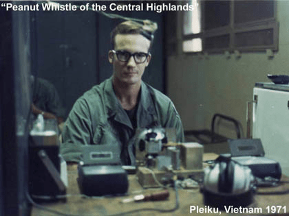 “Since the war was winding down (for us GIs at least) a lot of equipment was being turned in to our shop from field sites reducing their inventory as they shut down. That provided a marvelous opportunity for me to scavenge an excess intercom for conversion to what would become the Peanut Whistle of the Central Highlands, so named after the HAM (amateur radio) nickname for a low power transmitter.” – SP5 Schmidt