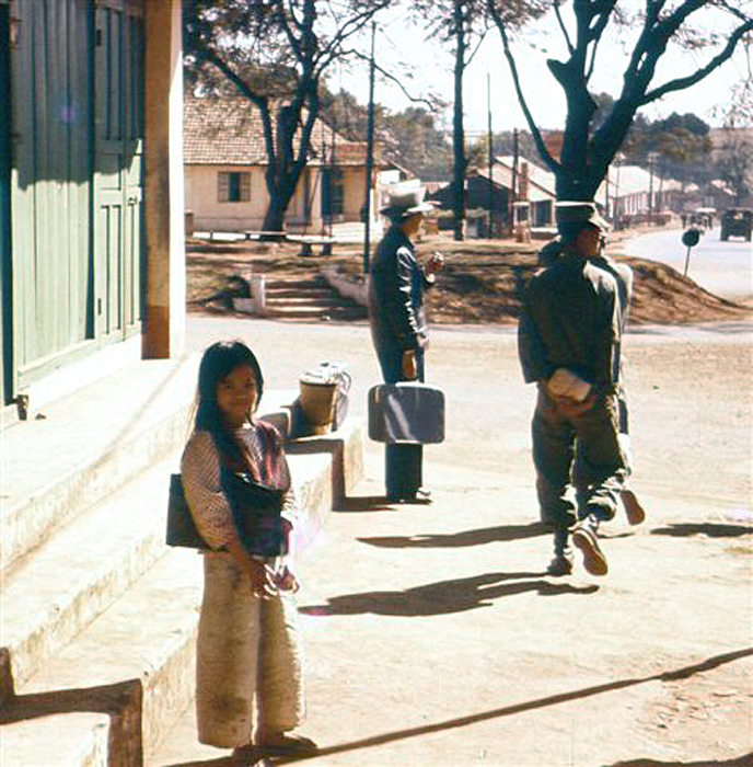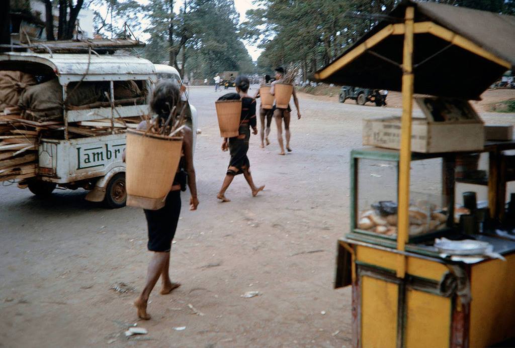 [The Montagnards] walk through town single file (out of habit from using narrow mountain trails) with baskets strapped to their backs and babies hung on their sides (and usually hanging on to a tit for dear life!). Or they squat around smoking weird pipes, their shaggy hair falling over their shoulders… an amazing sight! – Letter by David Noble, September 13th 1962