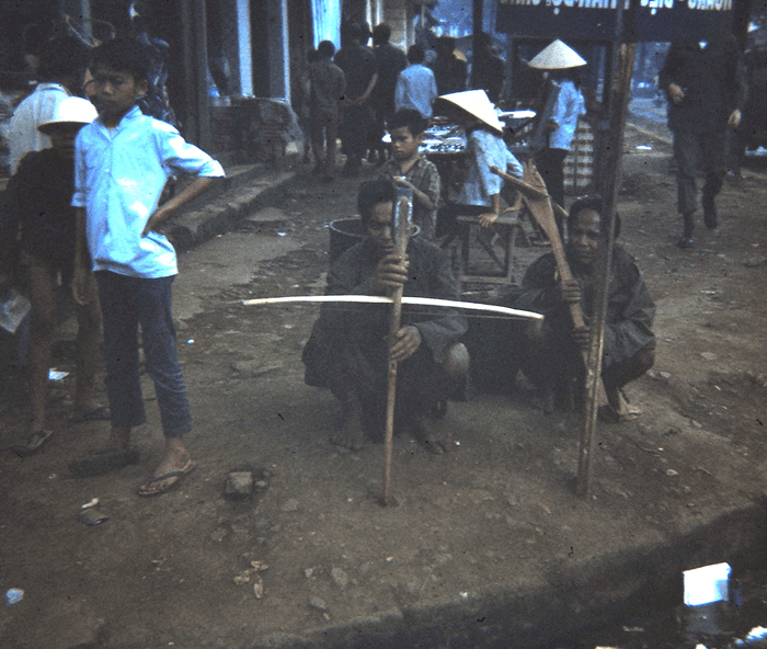 Low-rise buildings, rarely going as high as three stories, defined the cityscape[2]. The primary modes of transport were walking, cyclos, tuk-tuks (Italian Lambro 550s), and the occasional jeep—a stark contrast to Saigon’s streets filled with shiny, fashionable 60s cars. The streets were shaded by 30-year-old trees planted by the French, some of which still stand today, though many have sadly been removed and paved over.